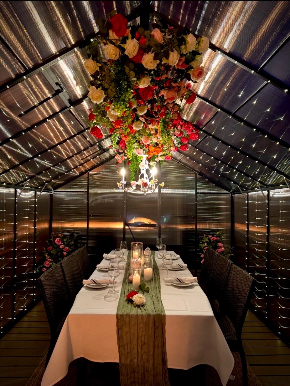Tucked within our garden patio, our private greenhouses offer an intimate, candlelit dining experience designed to feel both transportive and refined. Each space is thoughtfully styled with seasonal florals, soft ambient lighting, and layered textures, creating a warm, romantic escape just beyond the restaurant.